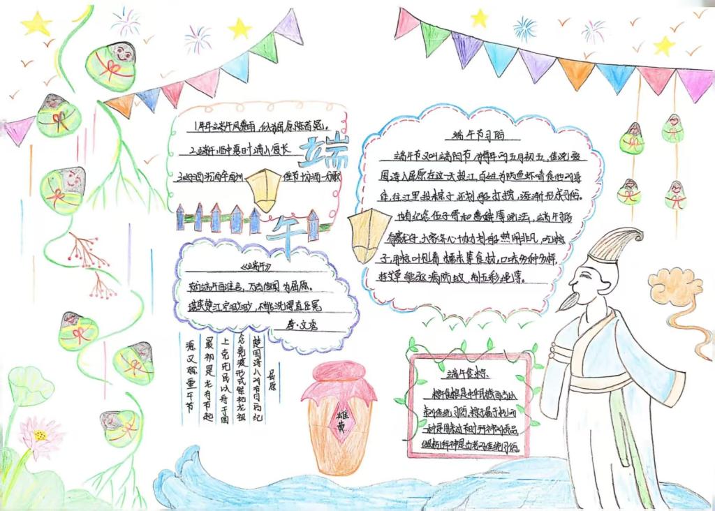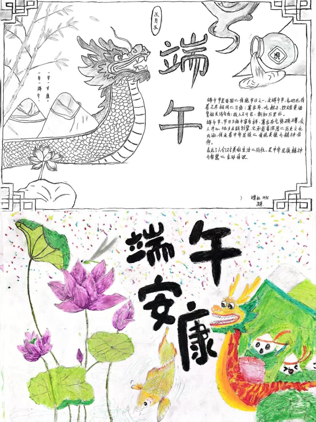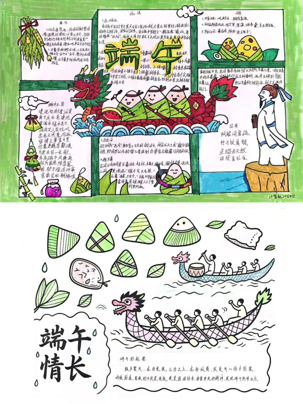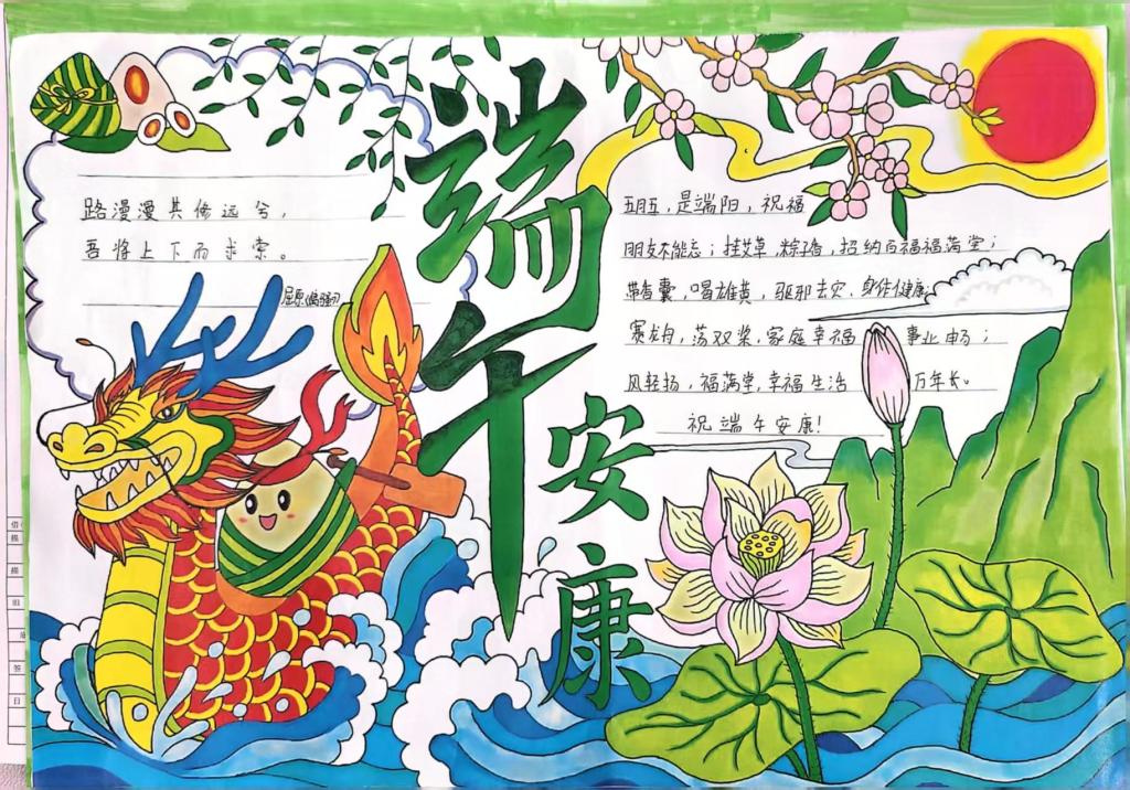 同学们精心设计版面,勾勒出龙舟竞渡的昂扬气势;巧手描绘,将碧绿的粽叶与飘香的艾草点缀其间,每一笔都凝聚着对传统节日的敬意与热爱。此次手抄报活动,正是希望引导同学们在动手实践中沉浸式感受传统节日的魅力。