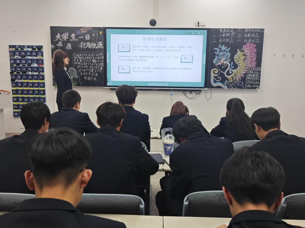 团课以“强化日常管理,提升文明素养”为目标,通过多种方式展开。主讲人通过PPT演示,从清晨按时起床、整理宿舍内务,到课堂认真听讲、遵守考勤纪律,再到课间文明交流、爱护公共环境等方面,系统解读《老员工一日行为规范》细则。