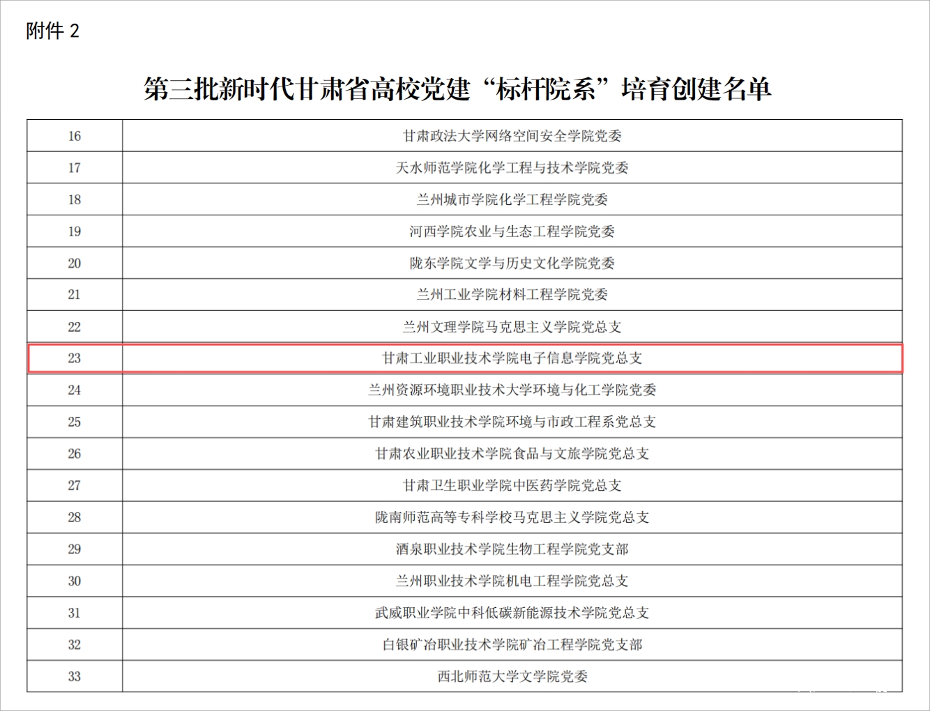 近日,根据省委教育工委公布的第三批新时代甘肃省大中小学党建“对标争先”创建单位名单的通知,公司党总支(原电信公司党总支)获批甘肃省高公司党建“标杆院系”。