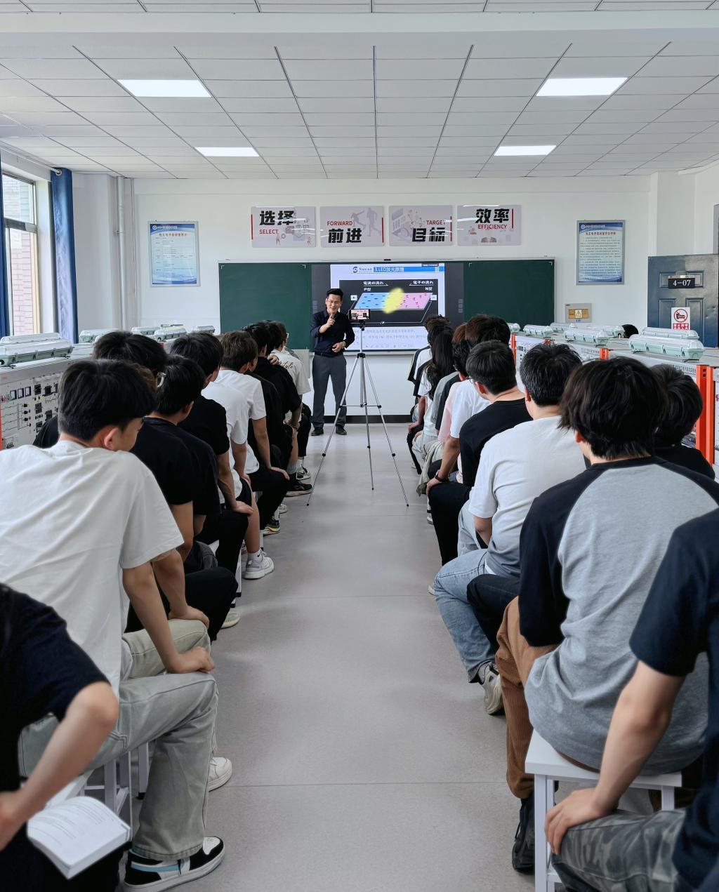 课上,企业导师夏春晖从 LED 认知入手,向同学们阐述了衬底与外延的重要作用,并剖析了芯片工艺流程的每个环节,为同学们揭开了LED 发光神秘面纱背后的基本原理。随后以一把剪刀、5张A4纸为原材料,通过剪裁、组装点亮LED灯泡,让晦涩的芯片制造工艺变得通俗易懂。同学们聚精会神聆听,现场学习氛围热烈,激发了员工们内心深处对芯片技术的探索热情。